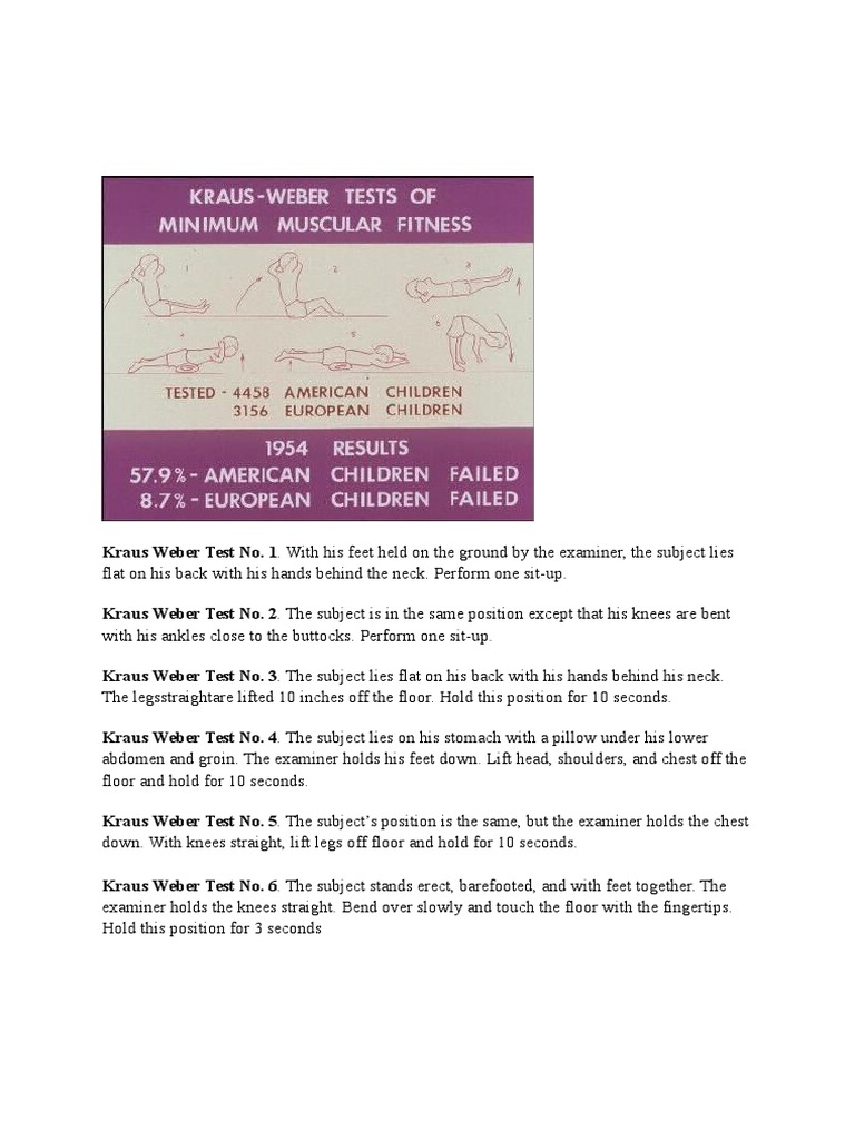 The kraus weber physical fitness report in 1955 based on the results of testing using these tests led to the development of the president s council on physical fitness and sports and the president s challenge program.